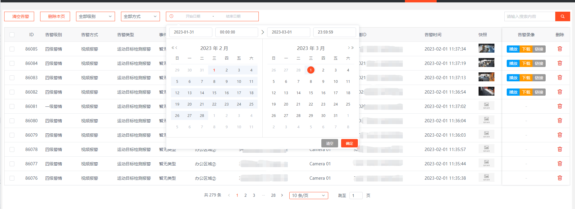 近期我们对EasyCVR平台的告警列表进行了优化,在告警列表中添加时间查询参数,方便用户更加快速查询对应的告警记录。