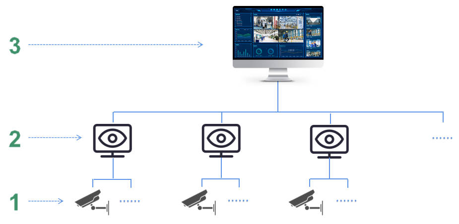 如上图,我们在每个小区内各部署一套EasyCVR平台,用来保障小区内的视频监控(1),再将各小区的EasyCVR(2)通过国标GB28181协议级联到物业公司总调度室的EasyCVR平台,进行视频汇聚与资源的统一管理(3)。