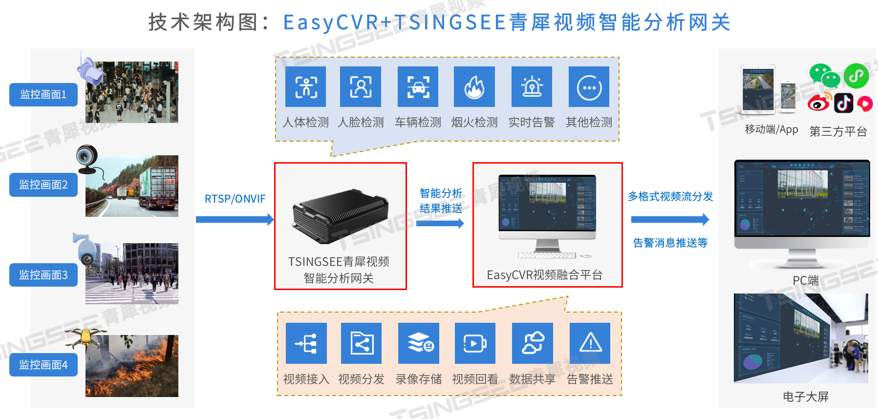 安防视频监控系统EasyCVR平台支持国标GB/T28181、RTMP、RTSP/Onvif协议等,以及海康SDK、大华SDK、海康Ehome等厂家私有协议,可覆盖市面上几乎所有的监控设备,也支持标准的API开发接口,支持电脑、手机、电视墙等终端设备播放监控视频,也可以集成至移动端APP、小程序、其他业务平台播放,十分方便工作人员的监管工作。视频平台支持单画面、多画面显示,可选择任意一路或多路视频观看,视频窗口数量1、4、9、16个可选。