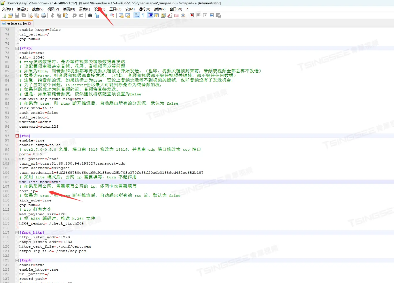 在EasyCVR平台配置文件mediaserver/tsingsee.ini中,对host_ip参数进行如下配置: