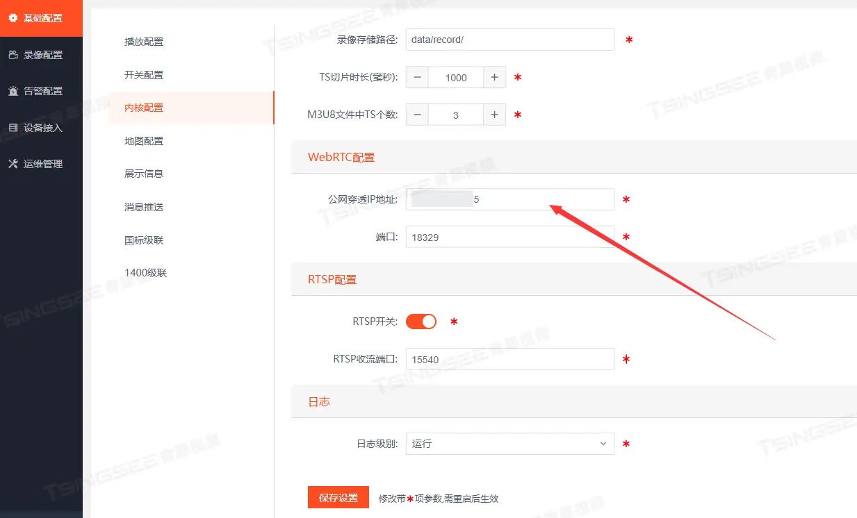 如果现场使用的是EasyCVR v3.6.0.1版本,则直接在【配置中心】-【内核配置】中配置webrtc的ip即可。