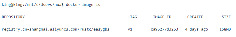 如上图所示,registry.cn-shanghai.aliyuncs.com/rustc/easygbs:v1对应的就是镜像ID就是ca95277d3253,在启动容器时,可以输入前几位如ca95只要能唯一标识该镜像就可以。实际的镜像ID会根据版本的不同而变化,如果通过镜像名称无法启动,可以根据实际情况采用镜像ID的方式启动容器。