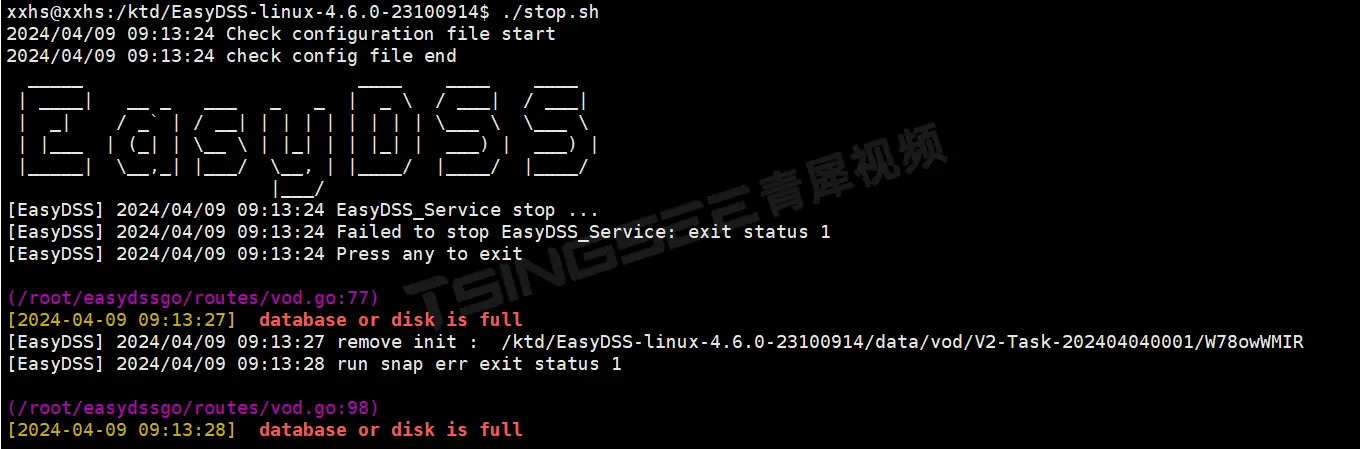 有用户反馈,现场测试完EasyDSS后,无法完成卸载操作,且报错“database or disk is full”,如下: