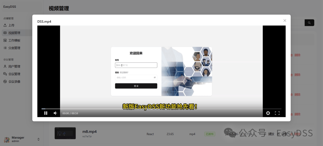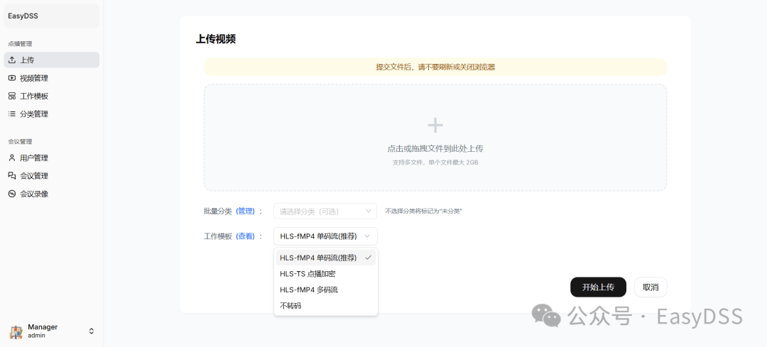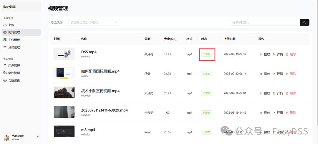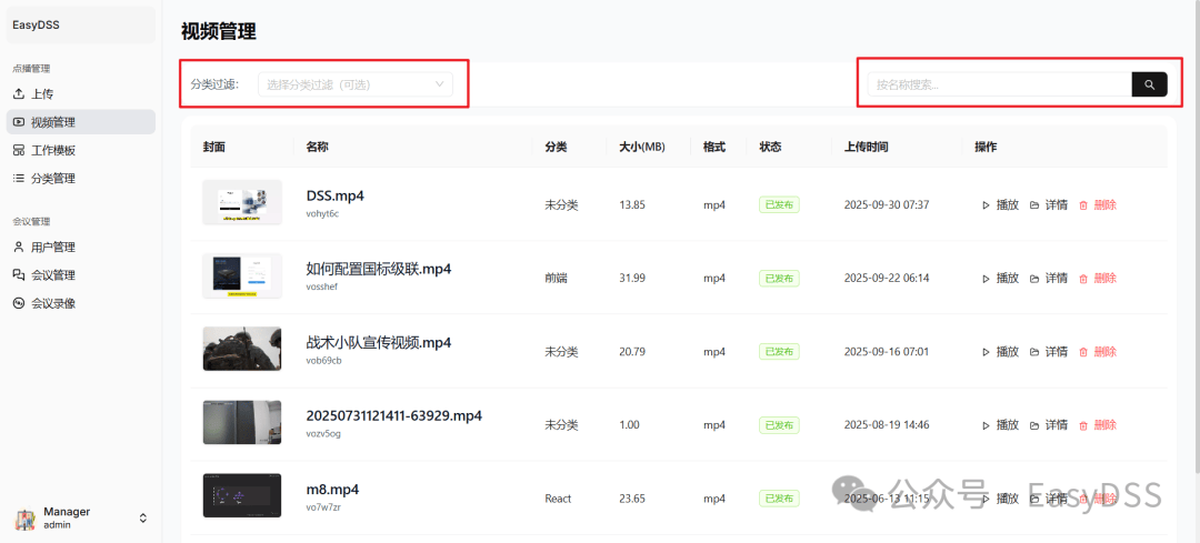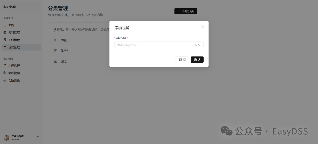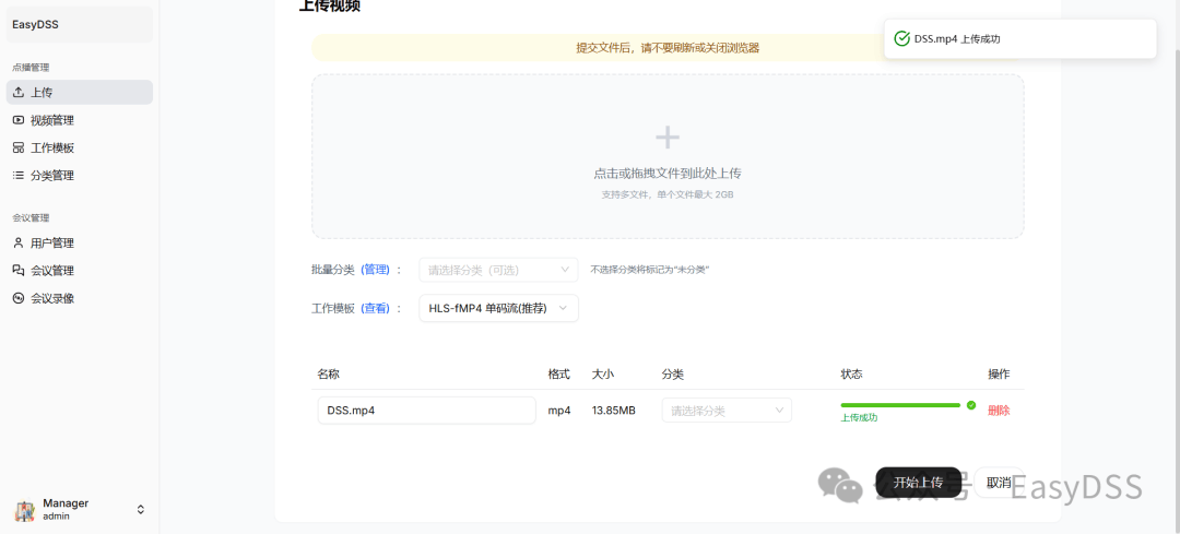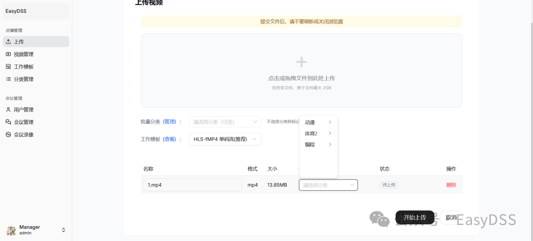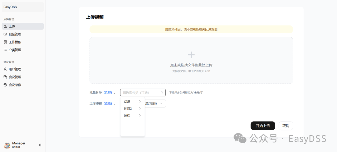 其实EasyDSS点播管理功能的核心就是“先设置(工作模块+分类)→再上传→最后管理”,每一步都很直观,没有复杂操作。不管是整理内部视频,还是分享点播内容,按照这个流程来,效率会高很多。