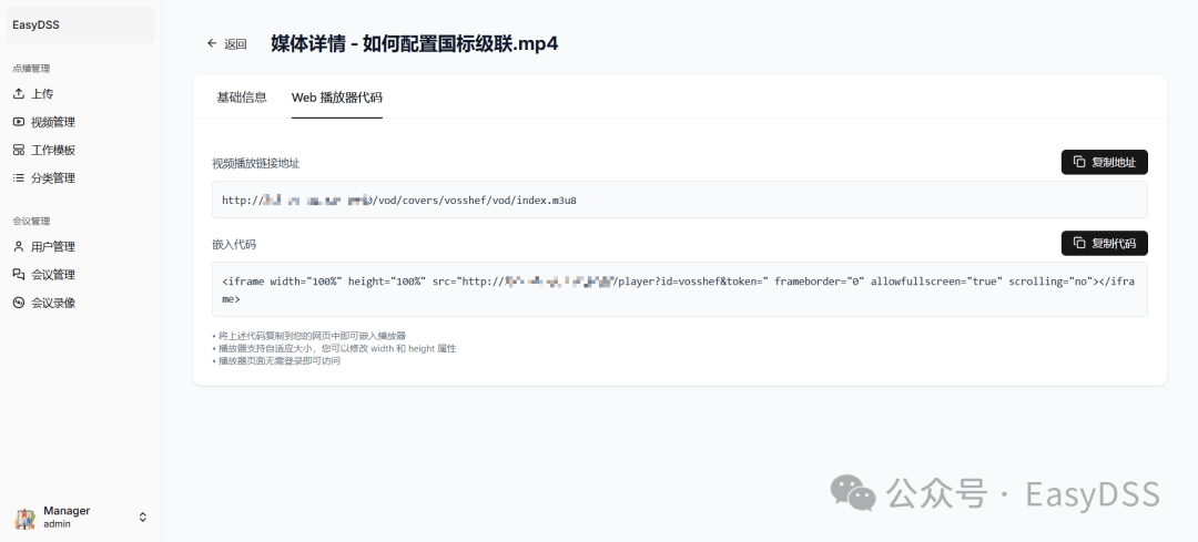 获取播放链接/嵌入代码:点击“Web播放器代码”,会直接显示该视频的专属播放链接和嵌入代码——要分享给同事,发链接就行;要嵌入官网或内部平台,复制代码粘贴过去,不用额外开发;