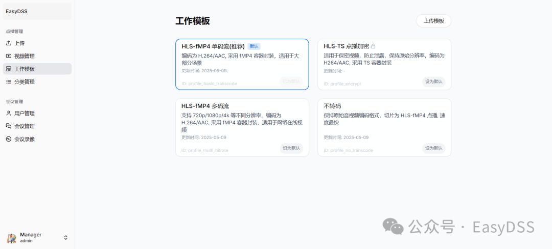 打开EasyDSS点播管理界面,首先看“工作模块”——这里提供了4种转码类型,覆盖不同使用场景:
