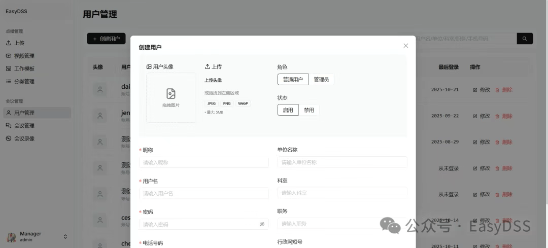 以前会议链接乱飞,外部人员随意进出,现在新版EasyDSS支持管理员与普通用户双角色权限,内部通讯录勾选即可参会,安全又高效。