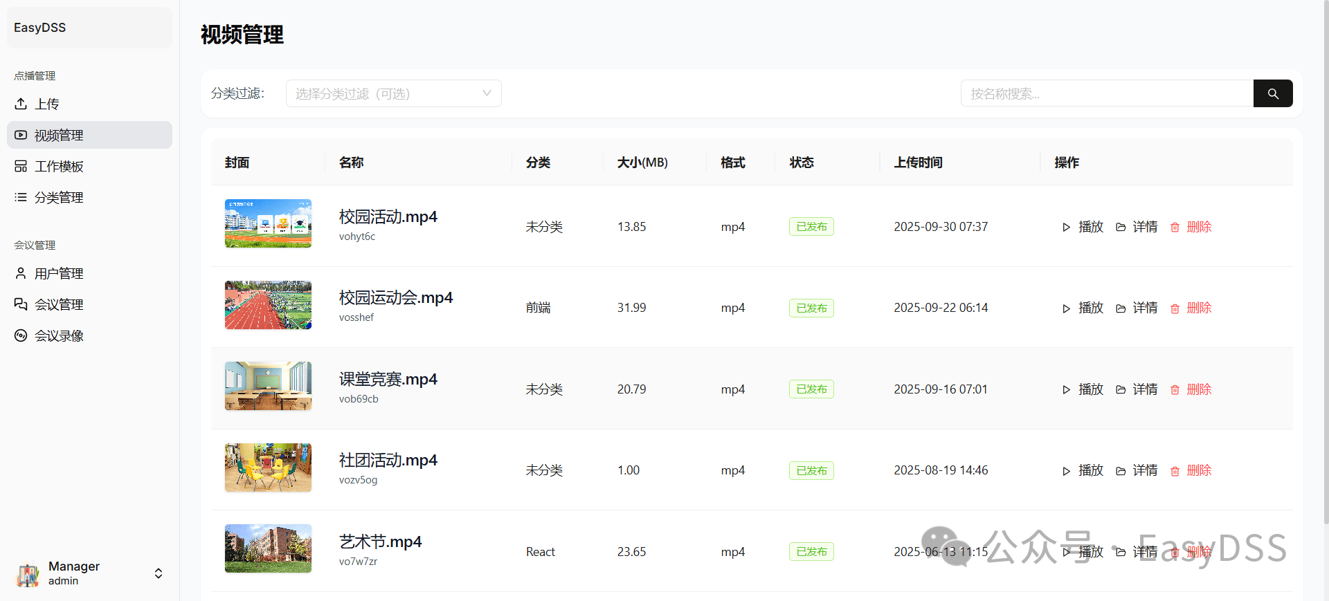 视频点播的首要环节是实现多样化视频资源的高效上传与标准化处理。EasyDSS支持RTMP推流协议,适配大文件分片上传功能,可有效解决高清视频上传卡顿、中断等问题,同时兼容MP4、FLV、MOV、AVI等主流视频格式,无需用户手动转换格式,降低操作门槛。