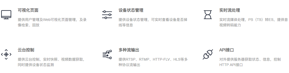 国标GB28181(以下简称EasyGBS)流媒体服务器提供用户管理及Web可视化页面管理; 提供设备状态管理,可实时查看设备是否掉线等信息; 实时流媒体处理,PS(TS)转ES; 设备状态监测、云台控制、录像检索、回放; 提供RTSP、RTMP、HTTP-FLV、HLS等多种协议流输出; 对外提供服务器获取状态、信息,控制等HTTP API接口。
