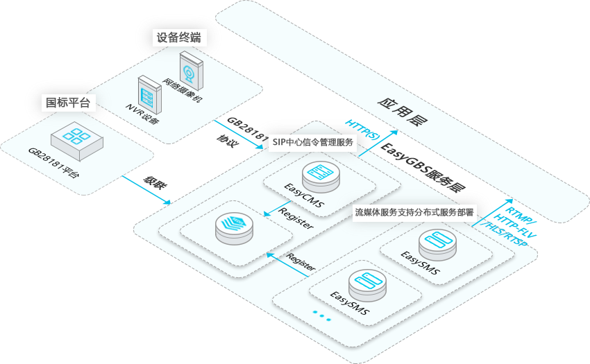 GB/T28181流媒体服务器(以下简称EasyGBS)是基于GB/T28181协议进行模块化设计、支持分布式部署;具有设备管理模块、信令模块、流媒体模块;支持多个中心信令服务器部署、支持多个流媒体负载均衡;流媒体模块支持RTSP、RTMP、FLV、HLS多种协议访问;支持对摄入摄像机的云台控制;完全满足全新建设的数字监控网络和已经部分建设的数字监控兼容部署。