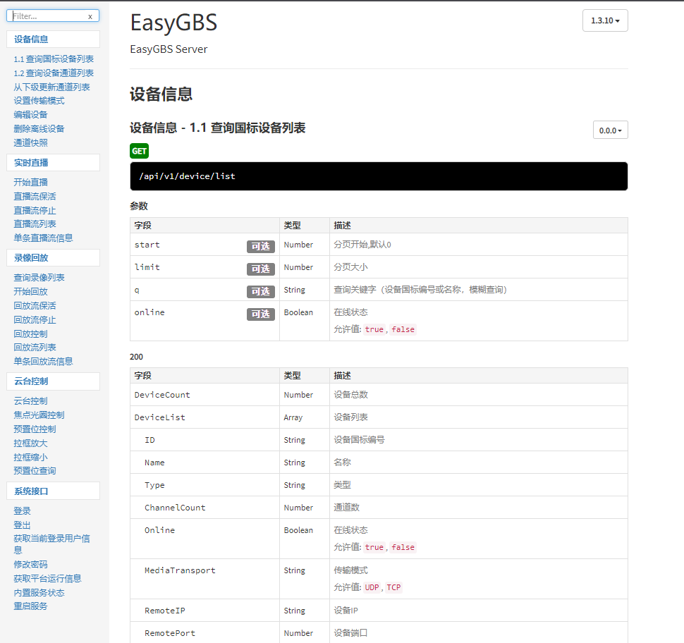 国标GB28181流媒体服务器对外提供丰富的API接口,可以供第三方调用,详细可以在接口文档处进行查询,如下图: