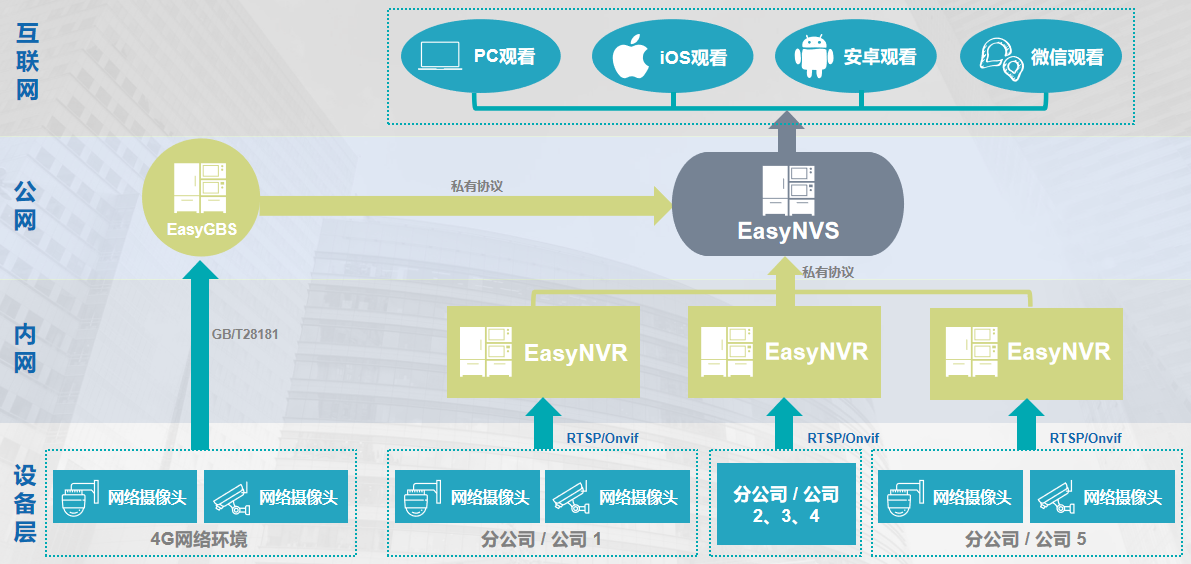 最近,一家建筑企业在智能工地项目中找到了我们,希望在视频流媒体方面进行技术合作。本项目分为多个站点,有工地也有分支机构,监控摄像头分散在多个站点上。同时前端设备支持协议不同,有支持国标GB/T28181协议的设备200路左右,有支持RTSP/onvif协议的摄像头100多路。想要多站点、多协议的摄像头进行批量访问,统一管理,现场视频流统一输出。并需要PC端、iOS端、安卓端、微信端等大部分终端的现场直播。