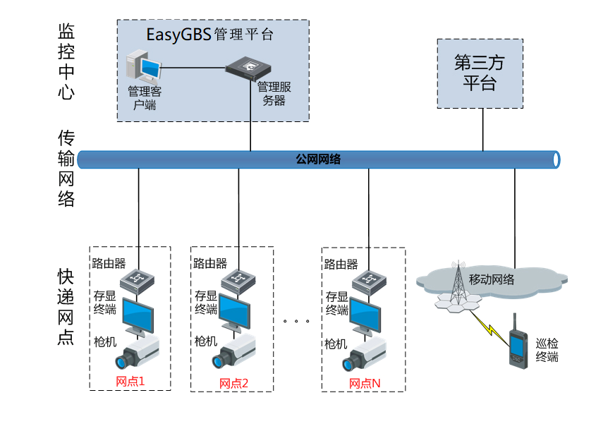 快递网点部署高清硬盘录像机和监控枪机,枪机用于收寄台视频监控,接入门店巡检终端硬盘录像机,再通过原有路由器接入公网,并传输音视频到后台监控中心。监控中心部署物流可视化EasyGBS平台,通过国标GB/28181协议来对接第三方数据平台。