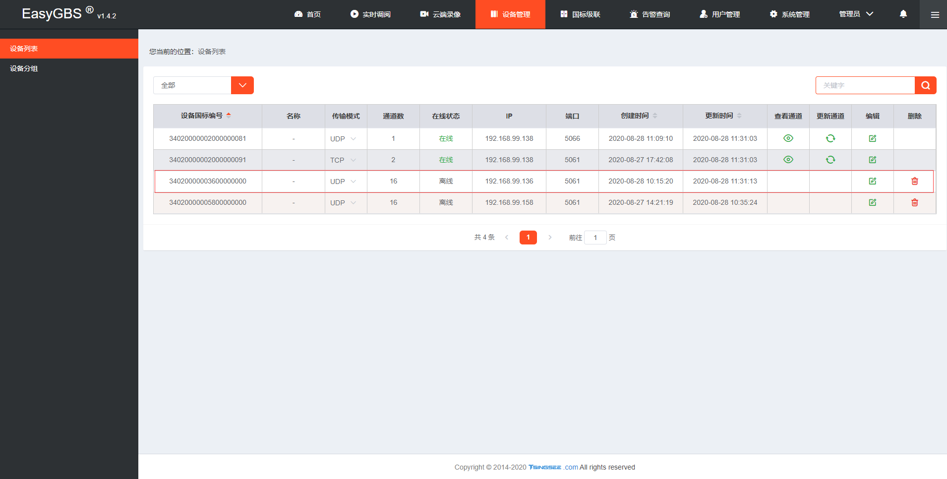 理论上,EasyNVR级联到EasyGBS上之后,EasyGBS上显示级联上去的EasyNVR在线,当EasyNVR级联关闭EasyGBS后,EasyGBS上的EasyNVR就会显示离线。但是前几天我们的技术团队在测试级联时,发现EasyNVR关闭级联后,在EasyGBS上还是显示在线的,需要等接近5分钟才会变为离线。