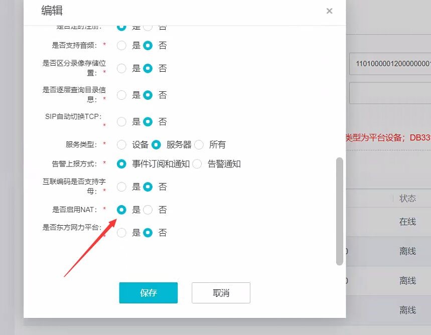 在配置好上述的信息之后,下拉滚动条,一定要在是否启用NAT上面选择“是”,由于平台默认是“否”,此时无法获取平台的网关,信息传不上来,必须选择“是”才能实现信息交互。