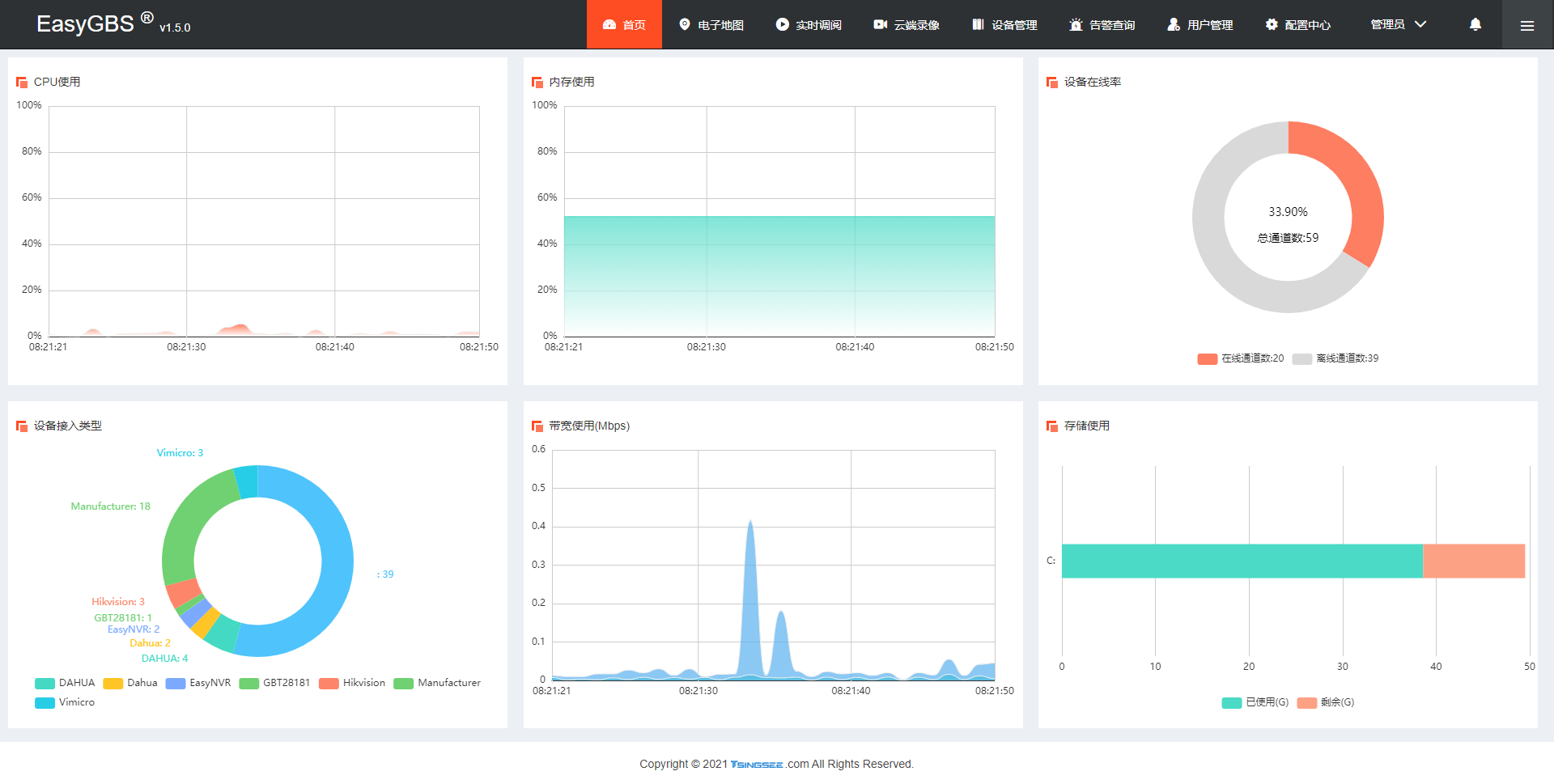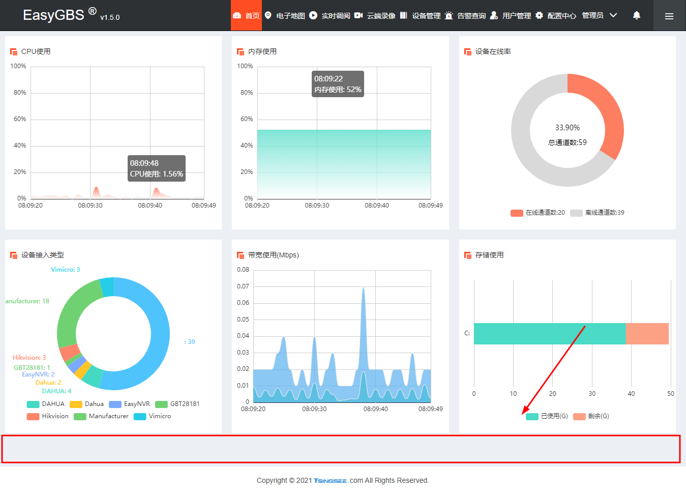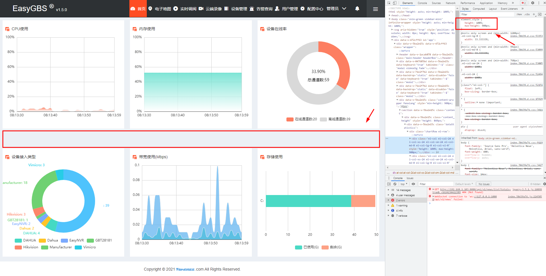 为了方便用户对整个系统的使用率有大致的了解,TSINGSEE青犀视频大多数视频平台的首页都会记录大致的使用情况,比如CPU的使用、内存的占用、带宽等服务器基本信息。在我们日常对EasyGBS测试过程中发现,进入EasyGBS首页后,页面内容无法占满页面高度,导致页面底部有留白。