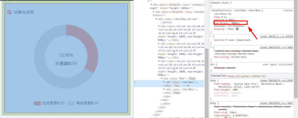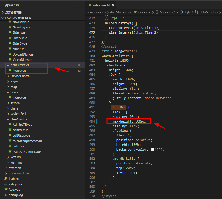 因此我们需要找到项目中的dataStatistics文件下的index.vue文件,将图表的最大高度修改为600px,也就是在下图标注的内容中做修改: