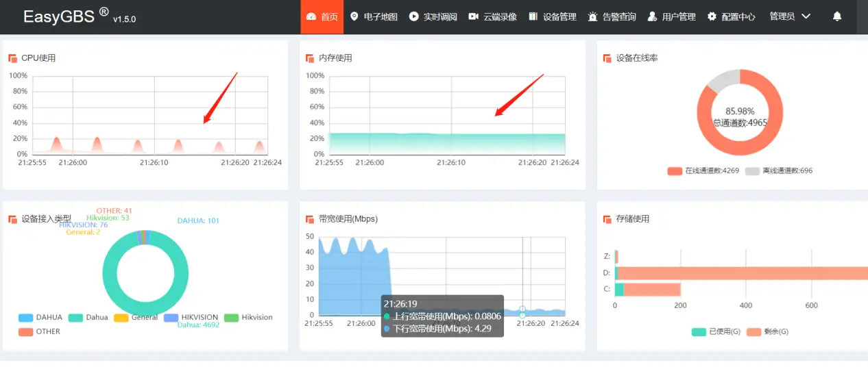 有的客户在EasyGBS接入大量通道并且播放数量也较多时,会导致服务器的内存以及CPU占用率特别高,虽然我们出过如何降低CPU的方法,但对于一些项目仍是难以解决。在和客户沟通之后,我们了解到该客户不方便更换服务器的硬件,因此我们考虑采用划分虚拟硬盘的策略,即把EasyGBS放到虚拟硬盘ramdisk里面。