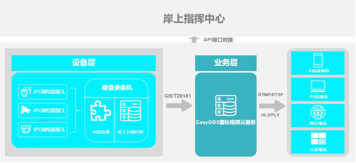 该方案是将存储置于船舶上,一方面节省流量和带宽,另一方面节省云存资源,所以我们建议网络摄像机直接接入船舶上的硬盘录像机,然后硬盘录像机通过GB28181协议主动注册到云端的EasyGBS视频云服务上,进行视频的统一管理与分发,同时支持通过API接口,国标级联的方式与上级的指挥中心对接,实时进行船舶上的监控,特殊事件还可以云端直接调取硬盘录像机中的存储文件进行比对和核查。