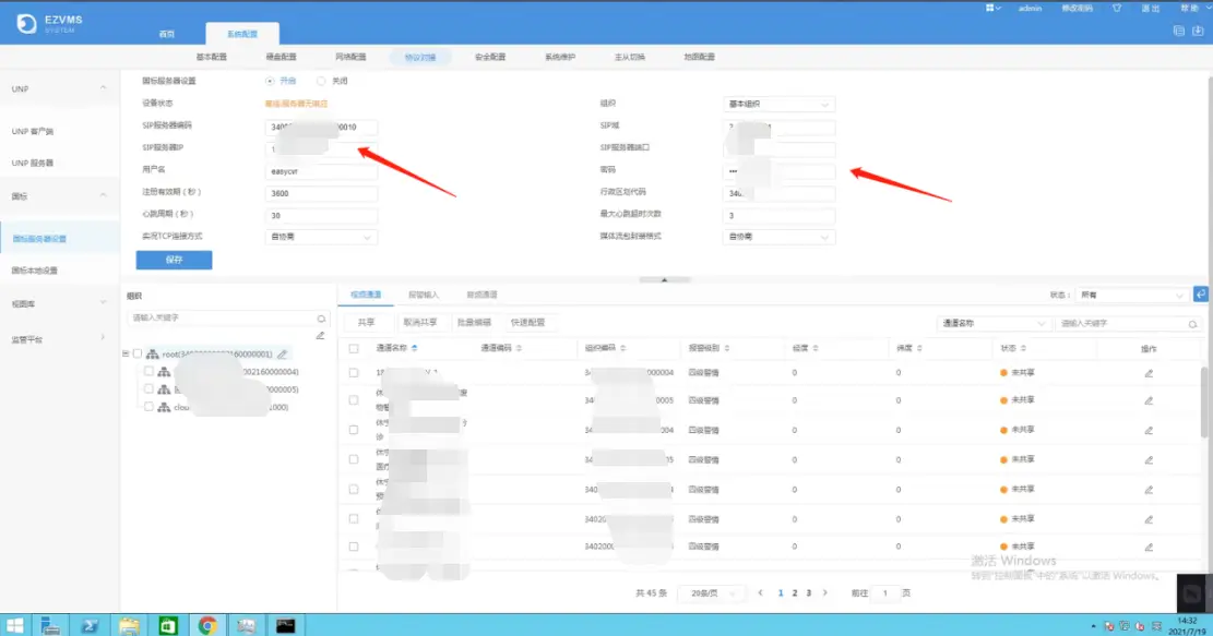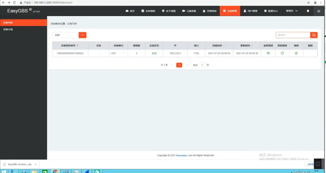 3、将信息填入完毕,配置完成后,便可开始共享通道,然后进入EasyGBS更新通道,就可以看到平台在线了。