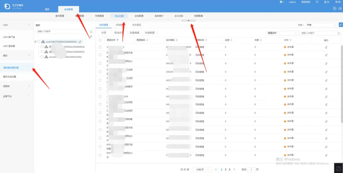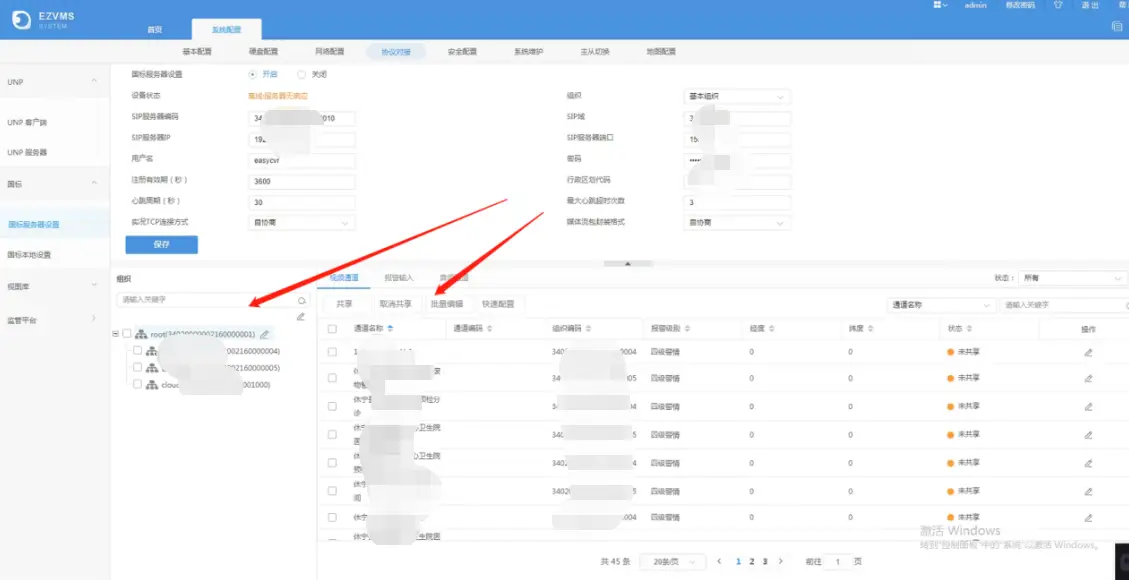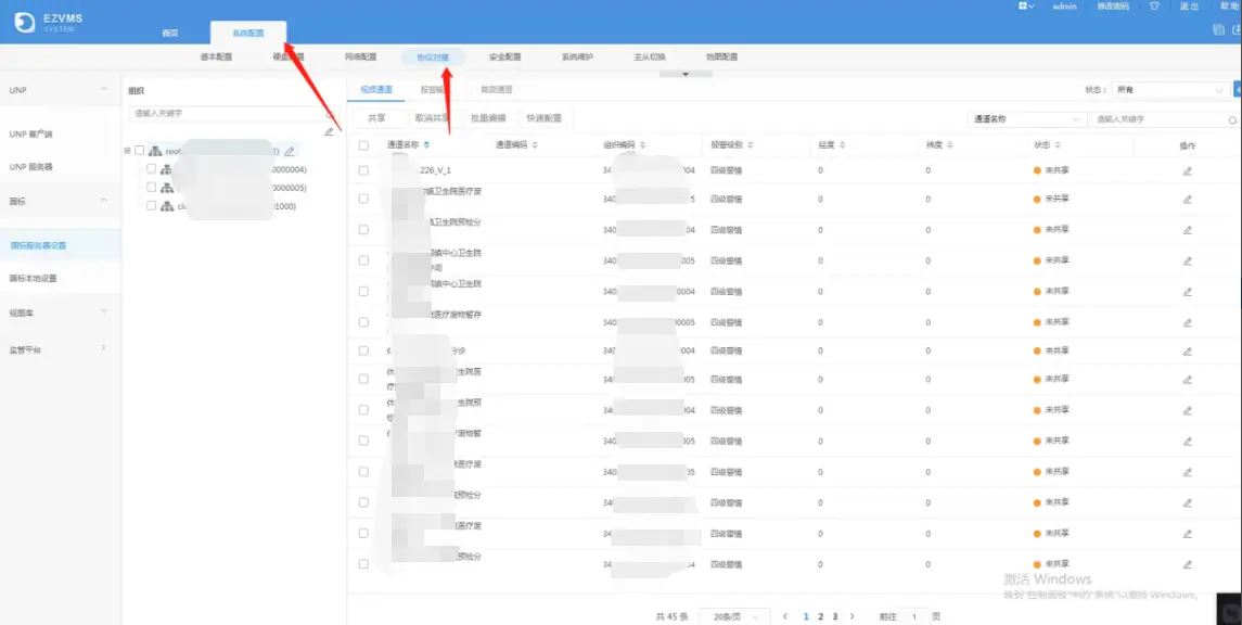 1、首先打开EZVMS的首页,并点开系统配置的协议对接,选择国标服务器设置,此时就会展示所有的国标通道和状态,包括通道的告警 、状态、编辑等内容。