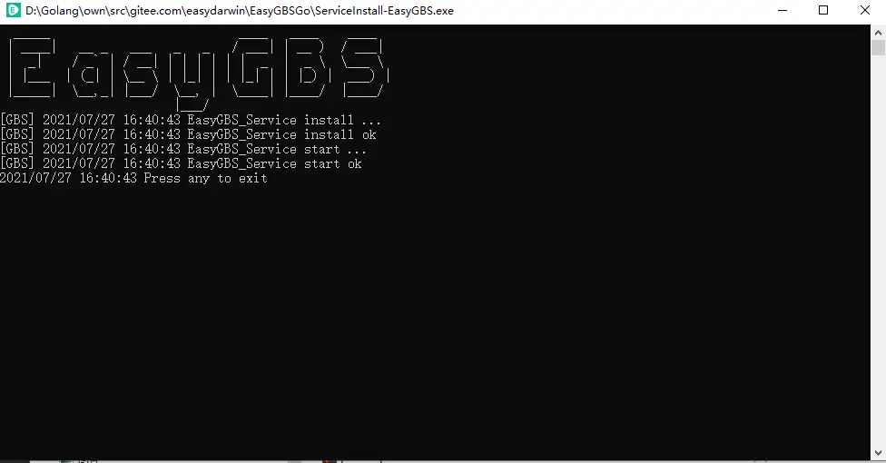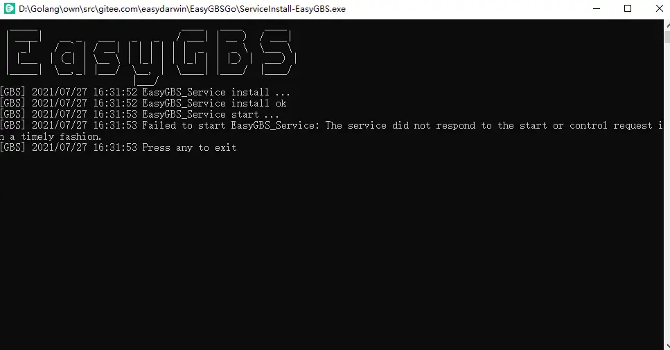 EasyGBS添加新内核过后,发现无法以服务方式启动,报错信息为Press any to exit,如图: