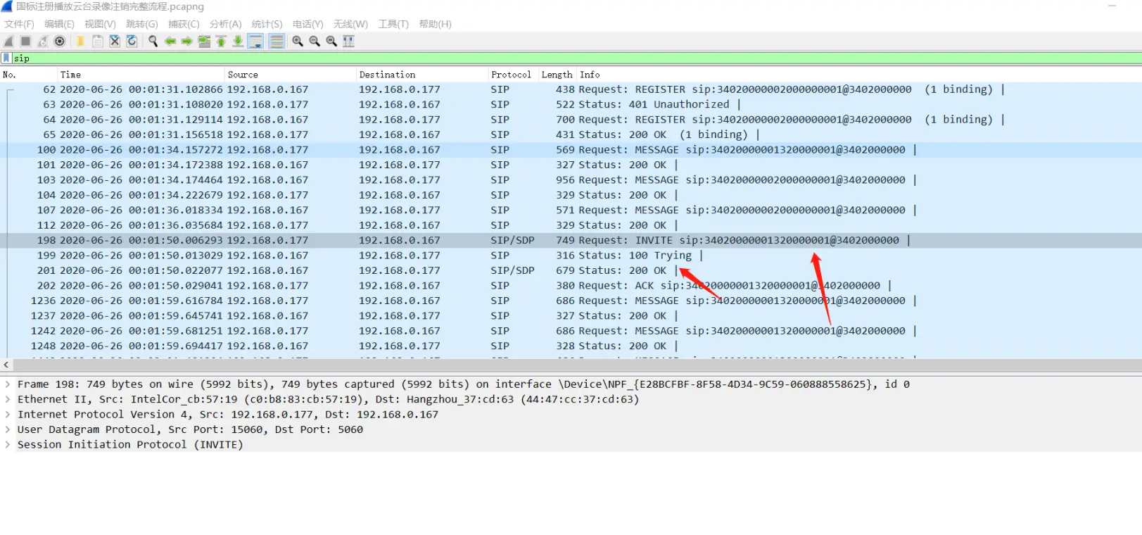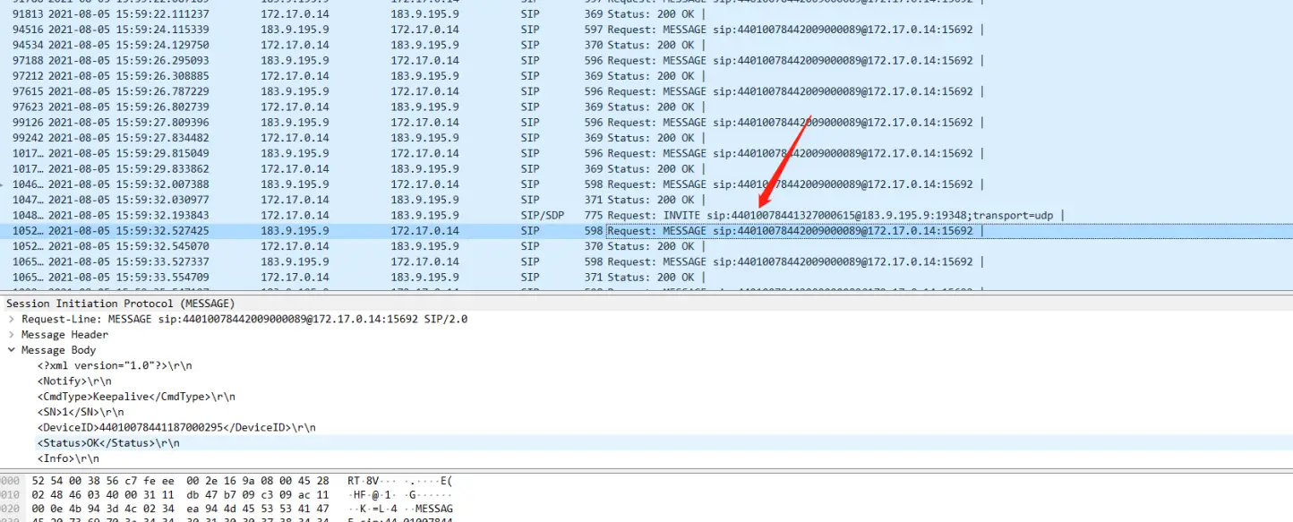 这个包可以看到我们这边发送invite消息设备端却没有回复。