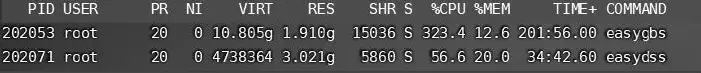 在该现场中,可以看到系统整体大概会占用50%左右的内存(其中easydss为EasyGBS使用的流媒体分发软件)。