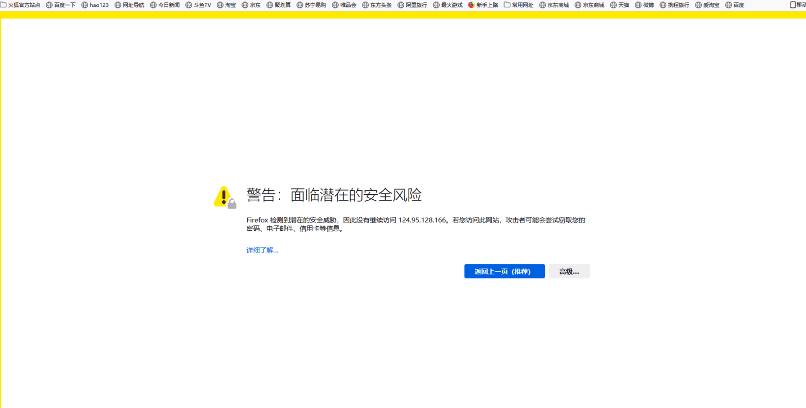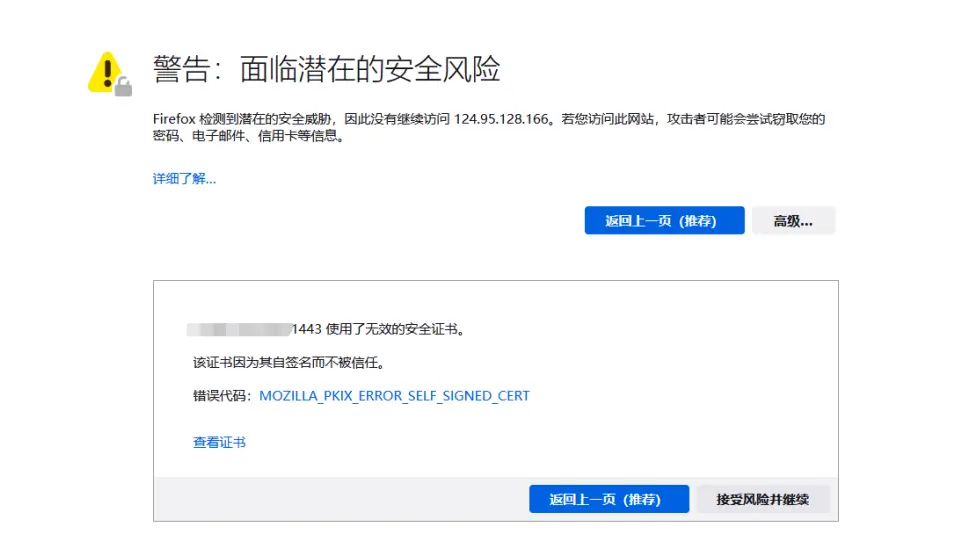 通过这个提示我们可以判断该证书并不正规,所以我们需要选择高级,点击里面的接受风险。