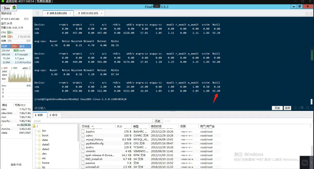 Linux里面可以调用命令iostat -x 1 10去检查,可以从命令里面看到客户磁盘读写已经接近利用率,基本已经快满了。