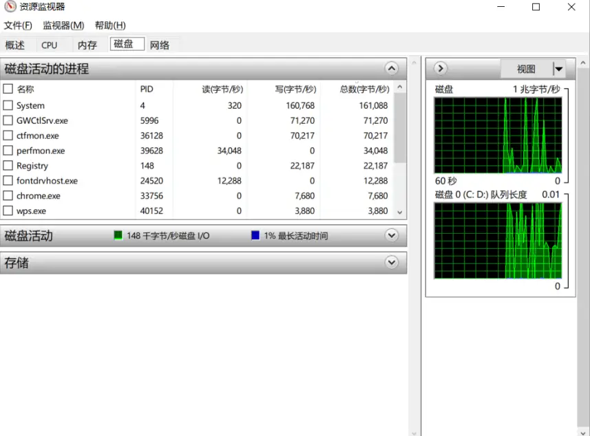 我们检查系统软件都没有问题之后,发现这个问题是由于客户的磁盘读写压力太大导致的,windows可以在资源管理器里面看到: