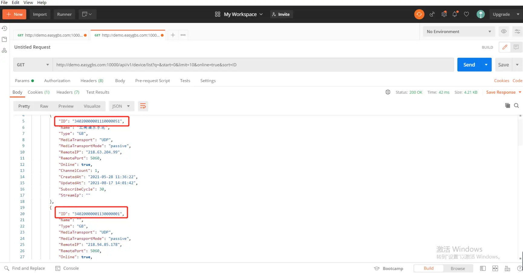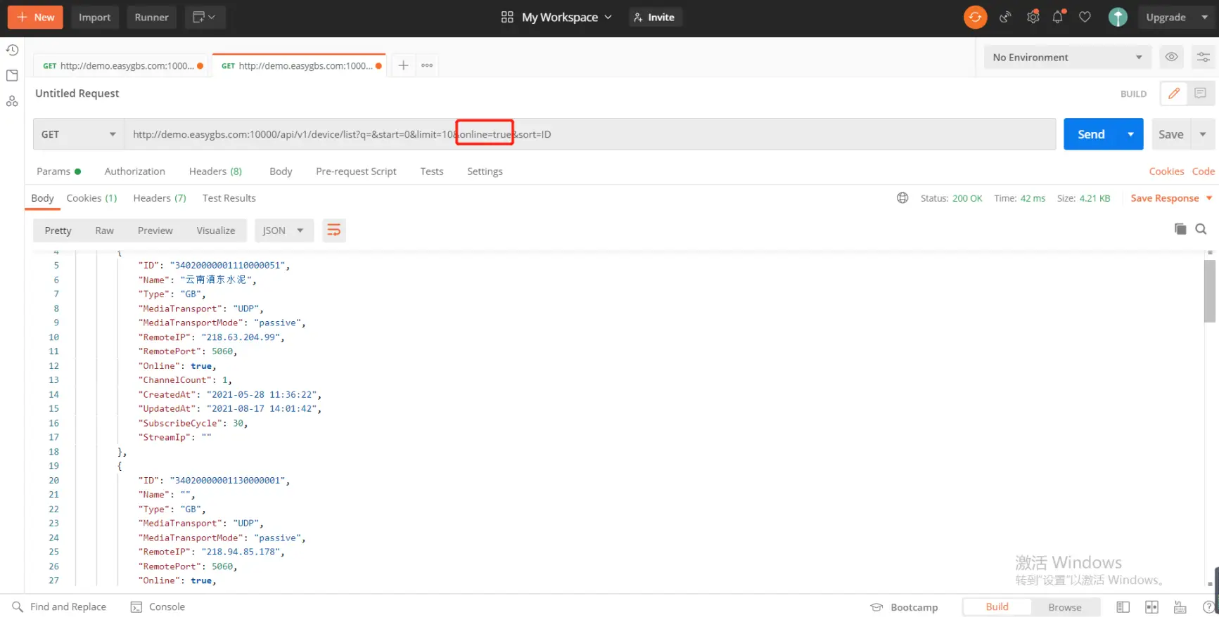 2.调用查询国标设备列表接口,注意此处必须加上online参数