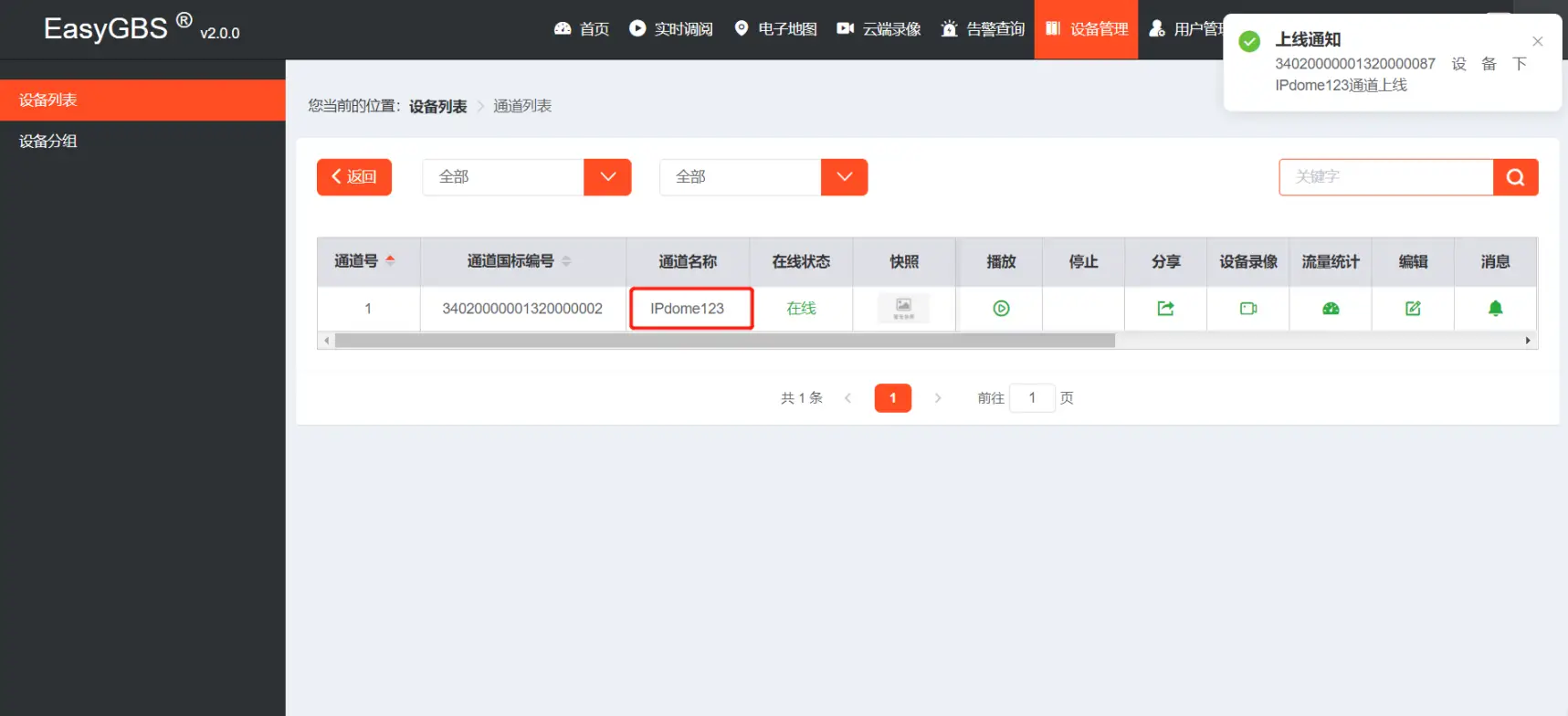 3.保存之后重新注册到国标平台(EasyGBS/EasyCVR),这时我们查看该通道就可以看到注册上来的名称已经变成我们定义的名称了。