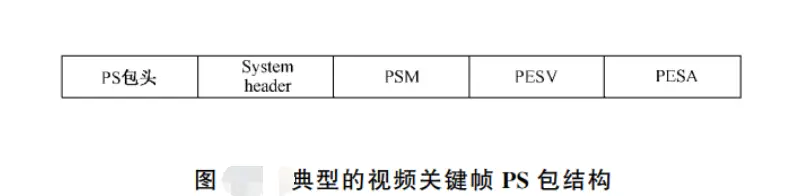 典型的视频关键帧 PS 包结构如图所示, 其中 PESV 为视频 PES 包,PESA 为音频 PES包,视频非关键帧的 PS 包结构中一般不包含系统头和 PSM。PS 包中各部分的具体数据结构参见 ISO/IEC13818-1: 2000 中的相关描述。