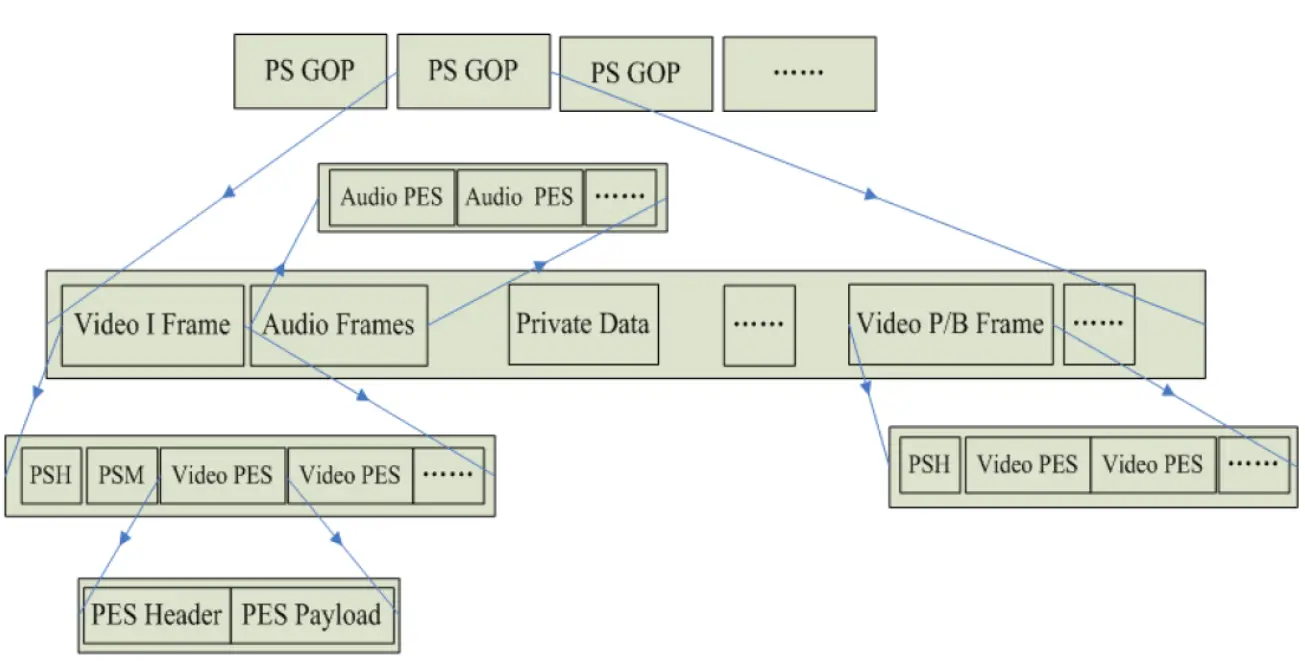 进行PS封装时,应将每个视频帧封装为一个PS包,且每个关键帧的PS包中应包含系统头(System Header) 和 PSM(Program Stream Map),系统头和PSM放置于PS包头之后、第一个PES包之前。