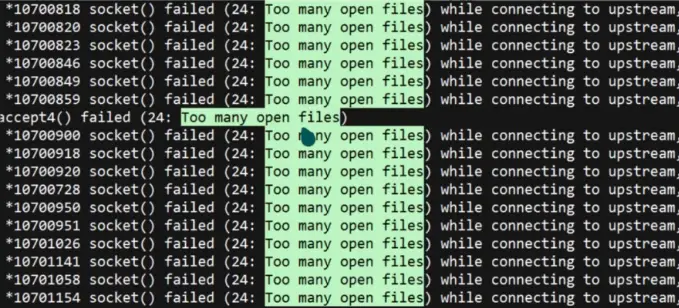 这个问题在接入量大,并且并发大的现场经常会遇到,原因是linux的最大进程数ulimit用完了,所以日志里面会有too many open files的报错:
