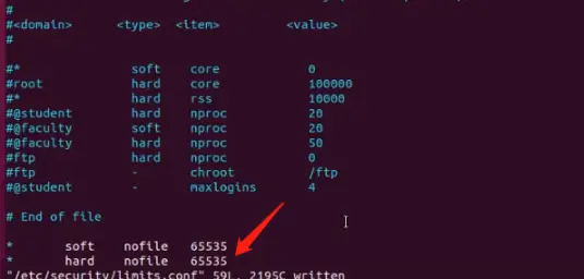 我们可以在Linux服务器里面修改这个数量,首先先输入vi /etc/security/limit.conf文件,在最后做如下配置(这里以设置参数危65535为例),然后保存: