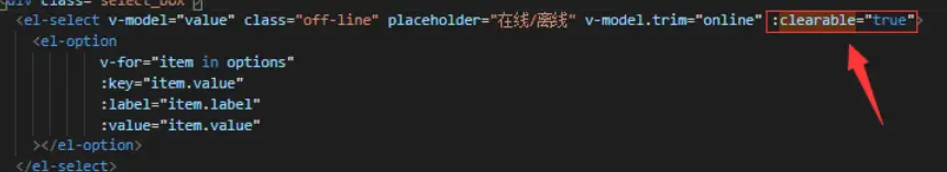 修改 clearable 属性值,定义为布尔值,后页面再无报错。
