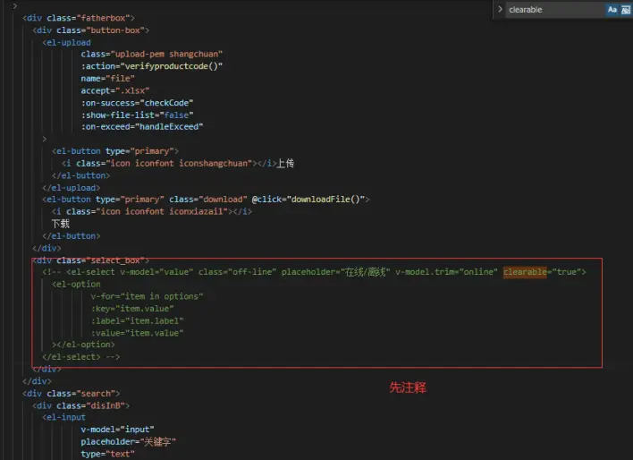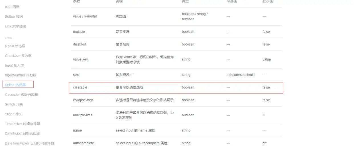 从错误信息的可以看出,无效的传入值,应为布尔值,但得到的却是字符串。在项目中搜索 clearable 并注销,发现此处并无报错误信息,说明和 el-select 组件有关。
