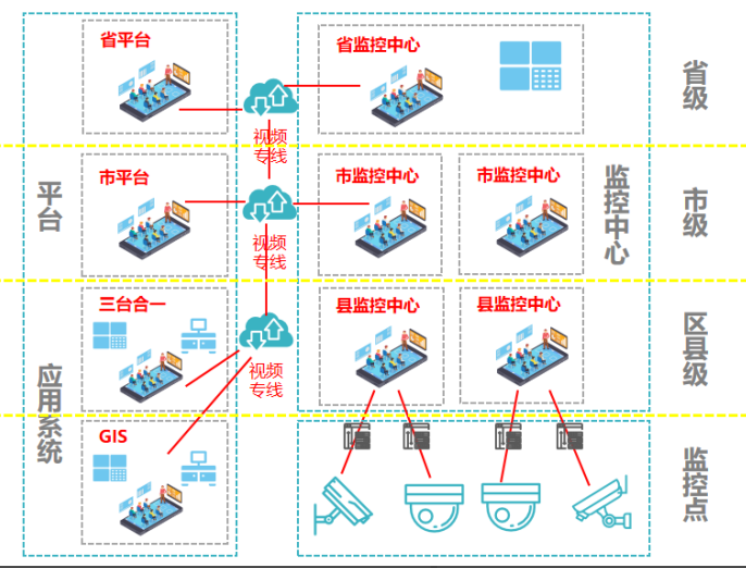 - 立体监管模式:实现前端、地市、省三级垂直监管,固定网络采用B/S方式进行访问,移动网络通过手持终端(手机、平板等)进行监管;