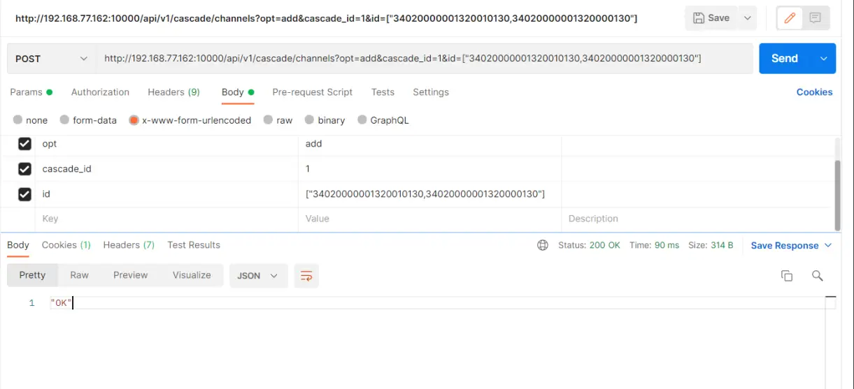 最后选择想要添加的通道后,将其带入到/api/v1/cascade/channels里面(注意这里要用post请求),参数没有错误就会返回OK,可以看到页面上也添加成功了。