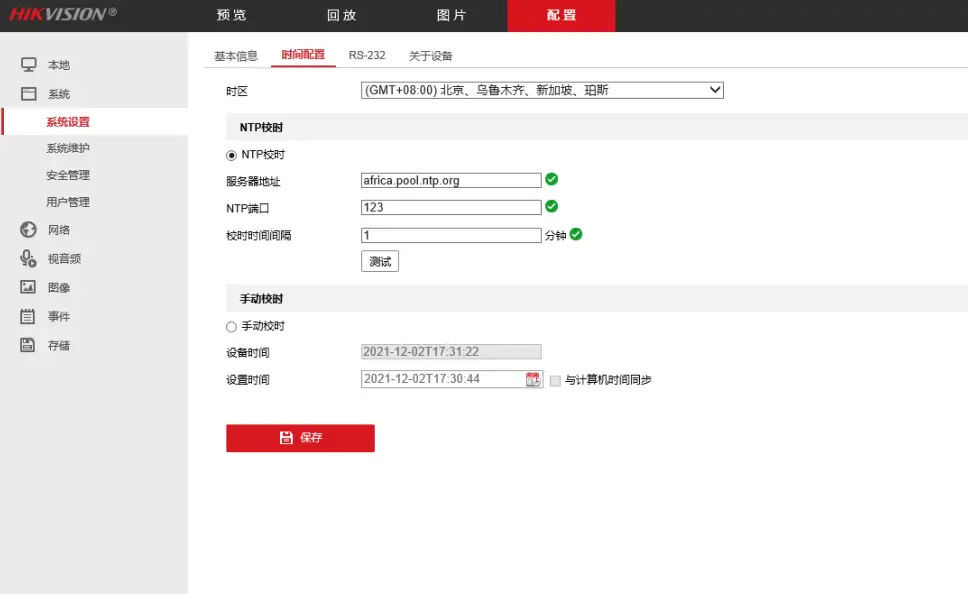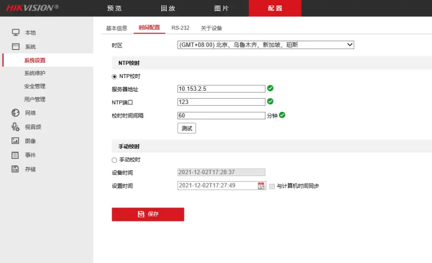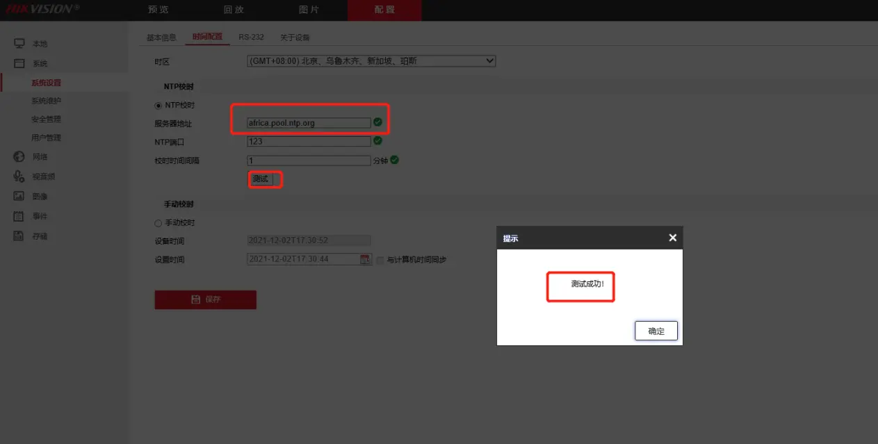 在摄像机页面点击测试,并将校时时间更改为1分钟,测试成功点击保存即可默认NTP端口为123: