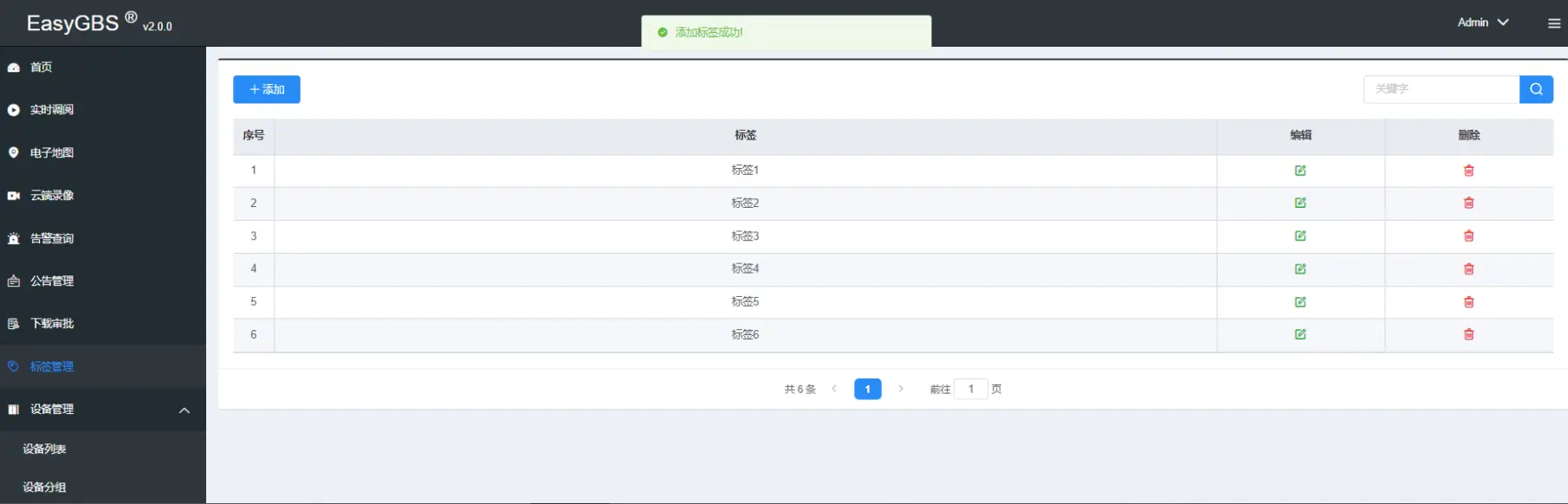 2.获取标签列表,这里在标签管理页面有此列表,在设备下通道里表中设置标签时也有显示所有的标签,此页面也可修改标签内容,删除标签操作。