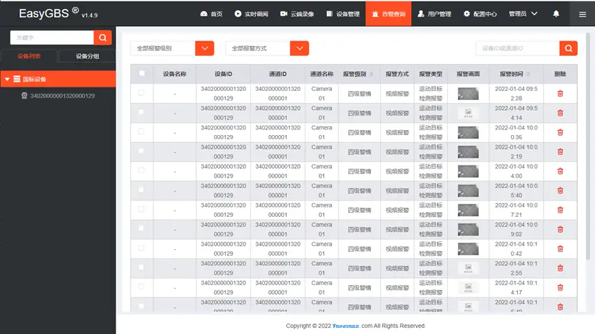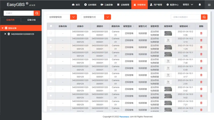 EasyGBS支持告警上报,当EasyGBS在底层数据收集上来后,再对原始数据解析,增加了告警计算后将告警信息持久化,当监测有异常情况时,系统就会自动截取快照并记录时间。