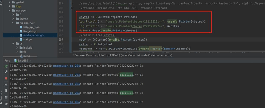 GO语言的内存释放是自动调用gc,无须代码调用gc。在排查时,发现在Cgo模块GO语言类型转换为C的结构cbytes时候,c.free调用有问题,unsafe.Pointer(cbytes)和&cbytes的内存地址不一样,如下图:
