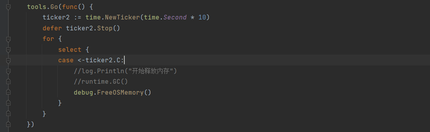 初步判断是这块free的时候参数有问题,于是将C.free(unsafe.Pointer(cBytes)) 改成C.free(cBytes)。修改后发现内存上升明显减少,但是还存在释放不了的情况,于是在main.go中加上主动释放GO内存的方法: