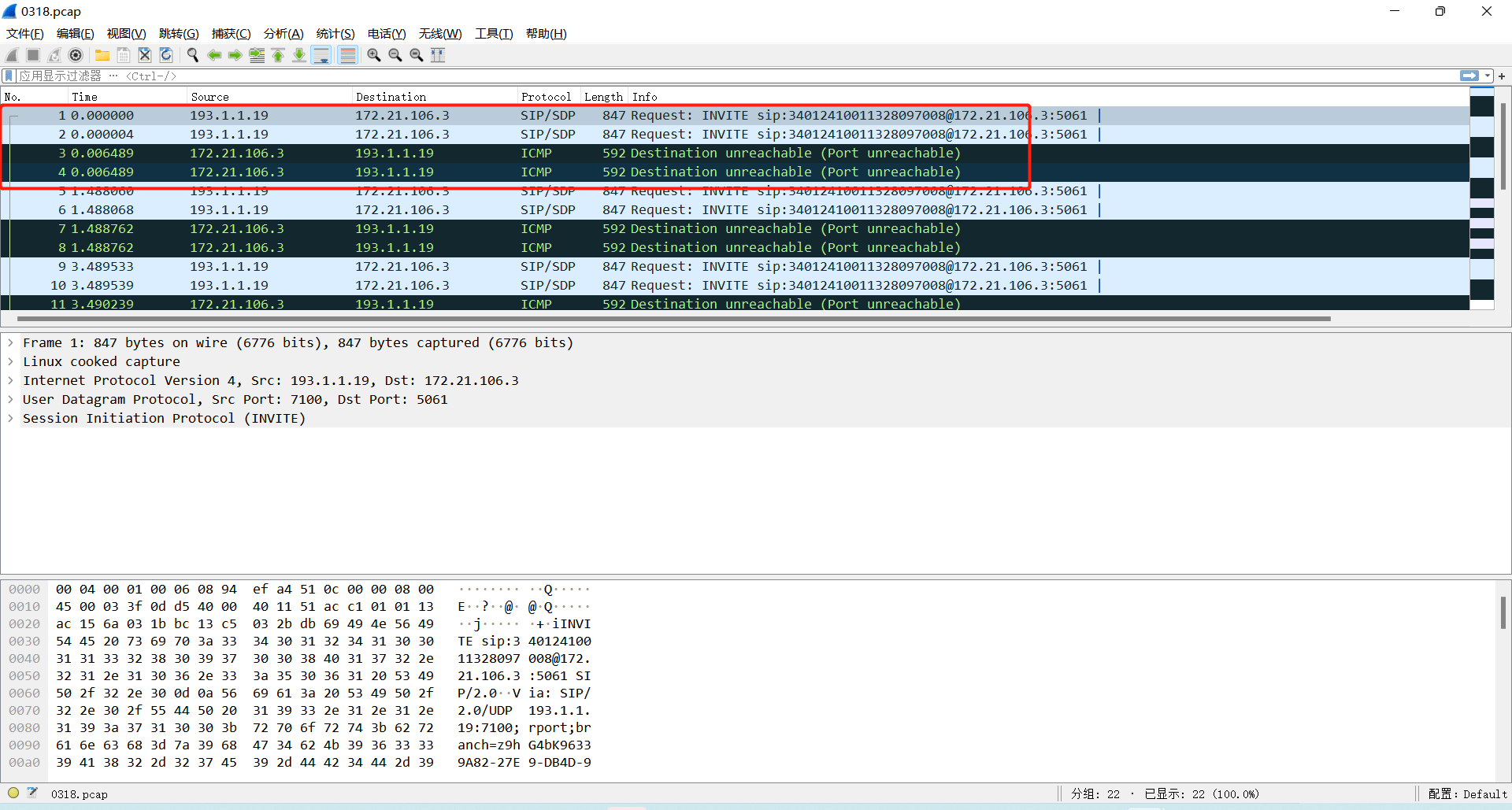 1)我们通过抓包查看,上级已经向本地发送invite消息,但是平台没有回复。