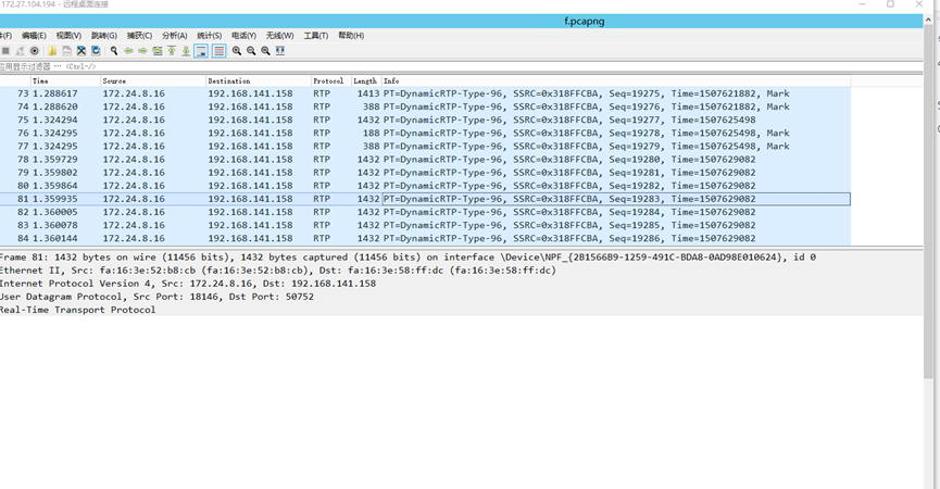 一般来说,遇到这种情况,我们可以先抓包卡查看。通过抓包我们发现,设备端的确已经发送了RTP的流过来,切片也没有乱序和丢包的情况。