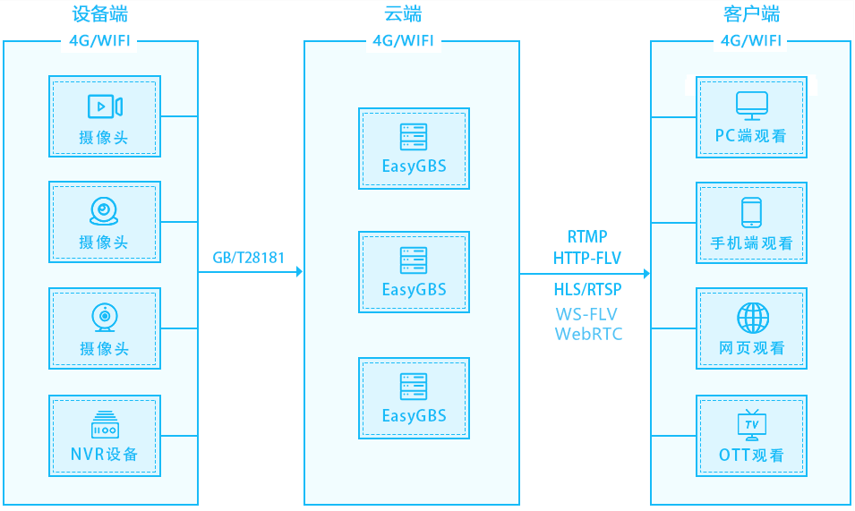 EasyGBS国标视频云服务能通过GB28181协议接入前端摄像头等设备,实现视频监控直播、转码分发、云端录像、存储、检索与回看、云台控制、语音对讲、告警上报、平台级联等视频能力。