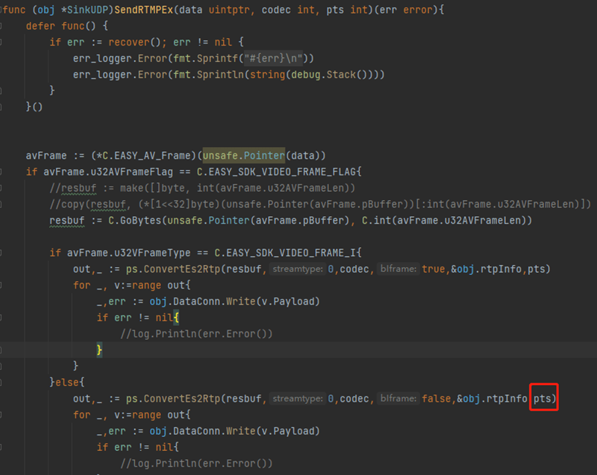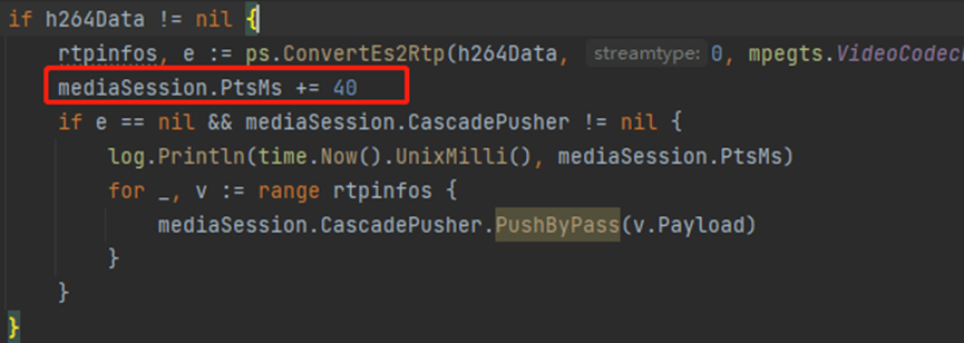 所以目前只有此处发送数据。于是我们用EasyCVR级联到EasyGBS进行调试。在EasyCVR断点中得知,有个pts参数时间每次发送数据都需要加上40ms。